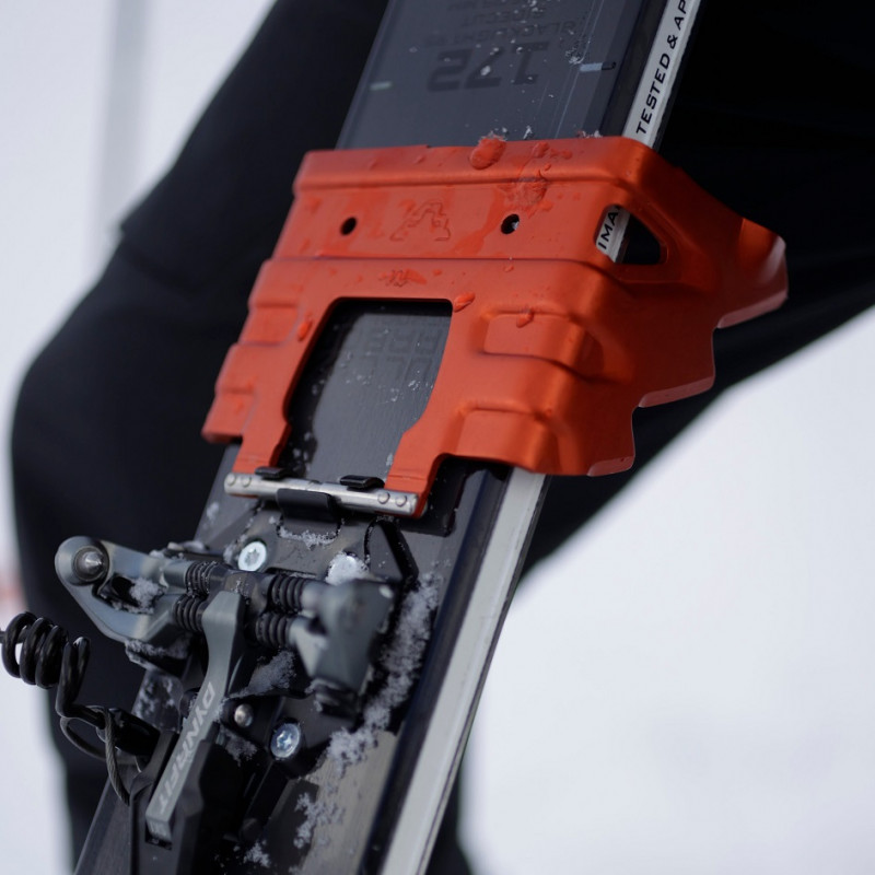 2. Das Harscheisen einrasten lassen, damit es mittig auf dem Ski liegt, bevor es heruntergeklappt wird.