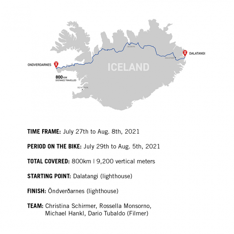 Wir, das sind Ross, Micha und ich, Chrissi, drei sportbegeisterte DYNAFIT-Kollegen aus Deutschland und Italien, die sich vorgenommen haben, Island mit dem Mountainbike zu durchqueren: Von Ost nach West und von Leichtturm zu Leuchtturm getreu dem Motto „Der Weg ist das Ziel“. Vor uns liegen 800 km und rund 9.200 Höhenmeter in acht Tagen ohne motorisierte Hilfe und mit minimalem Gepäck – und das alles obwohl vor diesem Trip noch niemand von uns so lange am Stück im Sattel gesessen ist. Begleitet werden wir dabei von unserem Filmer Dario.