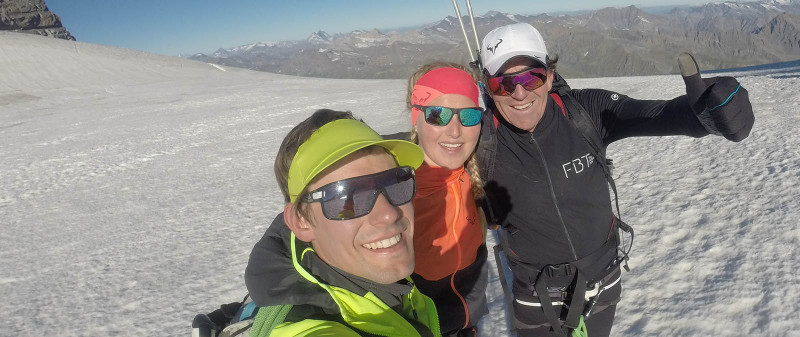 On summit day, I started out at 4 a.m. with our mountain guide Philipp Schädler toward the Chabod Hut, a small refuge hut at 2,800 meters above sea level. I was of course very motivated and was as excited as a small child. My dad had already headed up to the hut the day before and waited for us there. After a small breakfast there, we continued onward at about 6 a.m. toward the summit. In front of us we already saw a few lights that disappeared slowly as the sun rose higher. We made good progress and had to strap on crampons quite soon. With our three-person rope team, everything went like a breeze, and I just couldn’t stop marveling at it all. Although our pace to me felt slow, it was still significantly faster than the other teams.