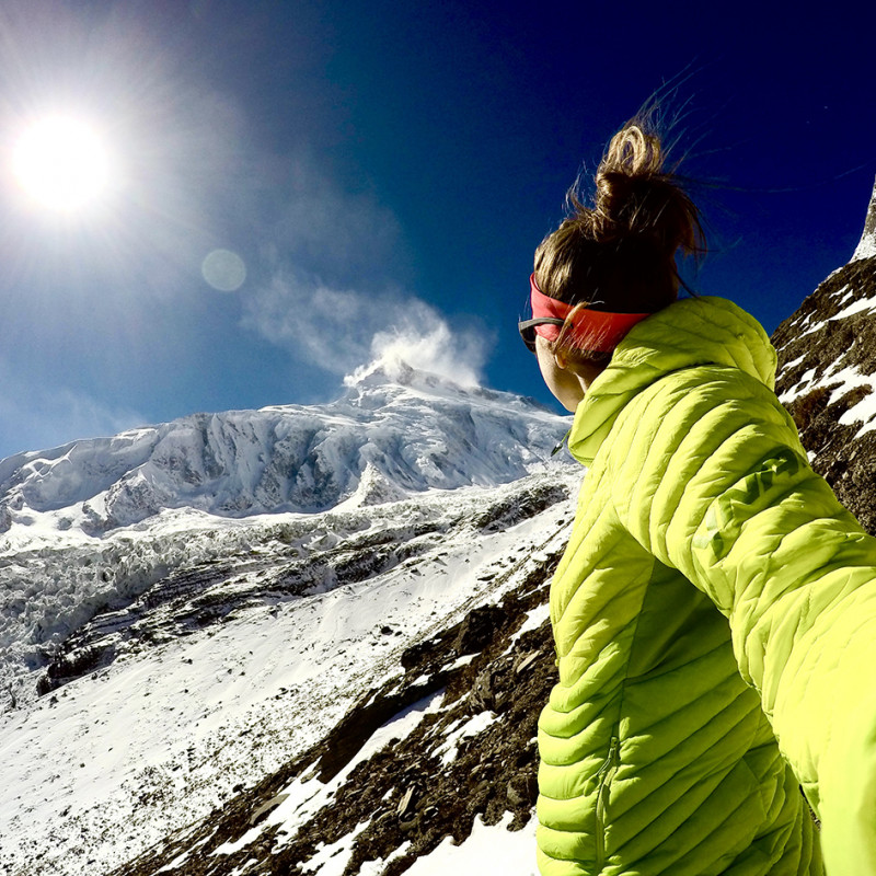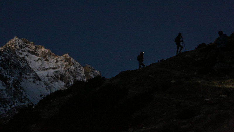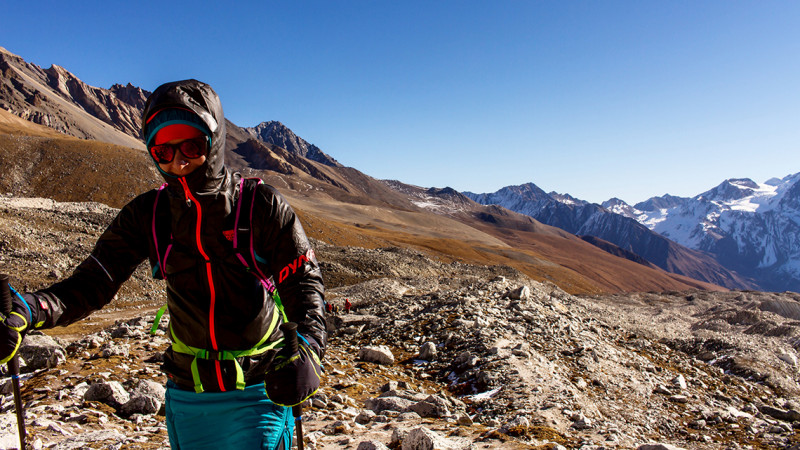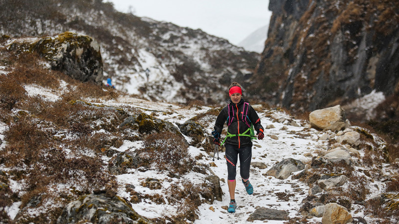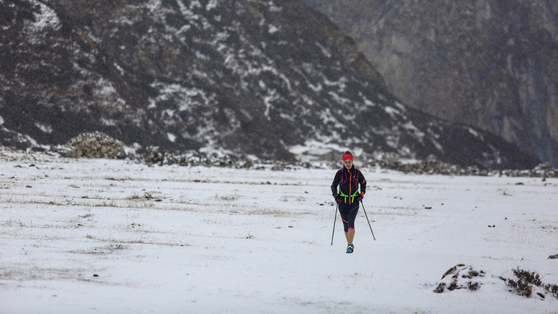 We headed out with headlamps. Since we were going up to an altitude of 5,106 meters over the Larke Pass, this was consciously not a racing day. It was still freezing cold, and I seriously was wearing every single thing I had with me, layered up from PrimaLoft to down. The quiet and the movement only by the light of the headlamps was somewhat meditative for me. It was possibly one of the most beautiful sunrises I have every been able to experience. Slow by slow, the gigantic mountains were illuminated by beams of warming sunlight. It was simply an unbelievable day. After just about nine hours with plenty of photo, tea and chocolate breaks, we arrived at our last lodging, at about 3,700 meters, before the finish. I was still very weak but simply thankful to be able to experience this.