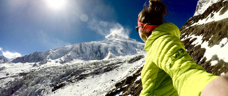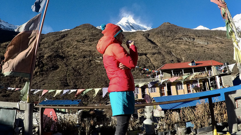 I had particularly looked forward to this stage! With a view out to Manaslu, we climbed up 1,100 meters up to 4,700 meters altitude just before the base camp. Here, there was a checkpoint where the clock was stopped. For two hours I simply sat in the sun and looked at the mountain that seemed close enough to touch. It was utterly perfect, enjoying the quiet and Mother Nature up here.